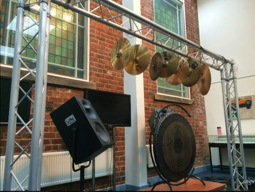 Jan 2015: I was asked to write a piece for LSTwo, the student contemorary music ensemble at University of Leeds. The euphonium was to be a particular focus of this piece, and through working with the player I set upon the idea of using the euphonium to excite a set of suspended percussion. In the first few tests, we attached contact-microphones (to pick up only the vibrations of the objects, not the the air-vibration of the euphonium) to various items; cymbals, timpani, gongs, piano strings, sheet metal. Microphones were generally positioned on or near the bell, depending on size of instrument: this favoured higher partials, and avoided damping the cymbal too much (though it would be interesting to place microphones at specific nodes along the cymbal edge to dampen selectively). All of these had some interesting responses; the timpani especially tended to produce the 5th partial especially strongly. For the piece itself I decided to use seven cymbals and a tam-tam: eight inputs because that was easy to integrate into the mixer system for this concert. The tam-tam was included because it responded to any pitch, and was useful was a base layer of plate-reverb. In perormance, the cymbals were isolated from the players due to feedback issues; the euphonium signal was projected at the cymbals from two large genelec speakers, slightly louder than an acoustic euphonium. The cymbal sound was fed back into the hall.